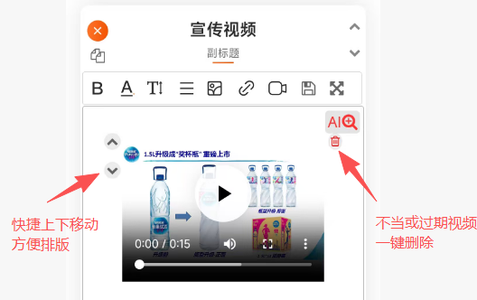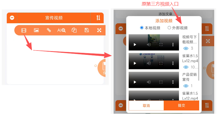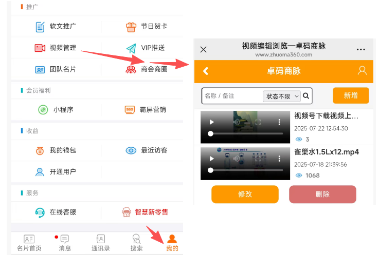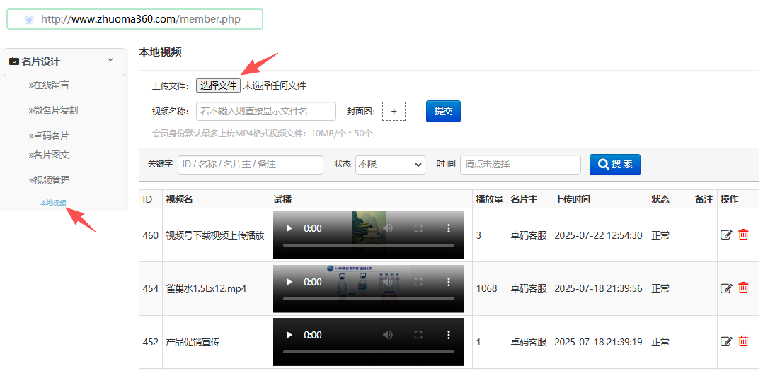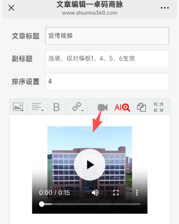 二、手机端视频调用操作1、模板3首页编辑一键快捷播放,无比丝滑体验~2、模板6首页编辑3、名片编辑>>首页图文编辑4、软文推广>>文章编辑三、电脑端视频上传入口及调用操作后注:1)会员及以上身份人员,默认最多上传MP4格式视频文件:10MB/个 * 50个;2)免费用户只可上传1个10MB以内的视频,欢迎体验~3)视频上传暂未纳入审核,但会事后巡检,发现违规视频将会采取禁播等处理措施;4)如超10MB的较长视频文件需播放,仍需借助第三方平台(即腾讯或优酷等,往其上传并审核通过有播放地址后再调用播放)